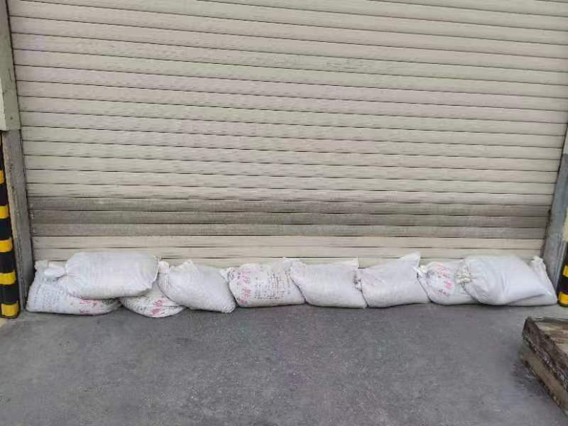 (圖為泉州鹽業(yè)配送中心倉庫準備應急防汛沙袋,對倉庫卷閘門進行防水防堵。)