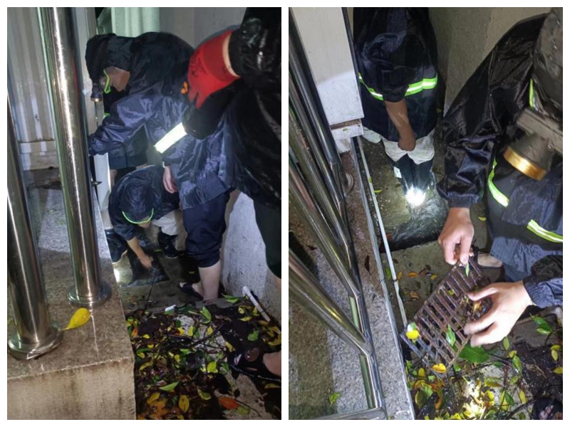 (組織職工冒雨開展園區內所有下水道清淤工作)