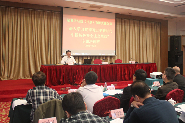 10月22日,福建輕紡在閩江飯店舉辦“學習貫徹習近平新時代中國特色社會主義思想”專題培訓班,福建輕紡黨組書記、總經理黃文定,黨組成員、副總經理陳國樑,黨組成員、紀檢組組長潘士穎,控股公司本部全體中層干部、權屬企業領導班子成員及全體紀檢監察人員共計80余人參加培訓。省國資委黨委委員、省紀委駐省國資委紀檢組組長黃共和應邀為福建輕紡干部上了一堂題為“學習貫徹習近平新時代中國特色社會主義思想 堅定不移推進國有企業全面從嚴治黨”的黨課。