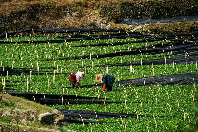 走進下坑村,只見村口溪邊的田地里,一壟壟二十幾厘米高的茶苗在陽光的照耀下顯得格外青翠,村民則在田間忙著給這些茶苗除草施肥。