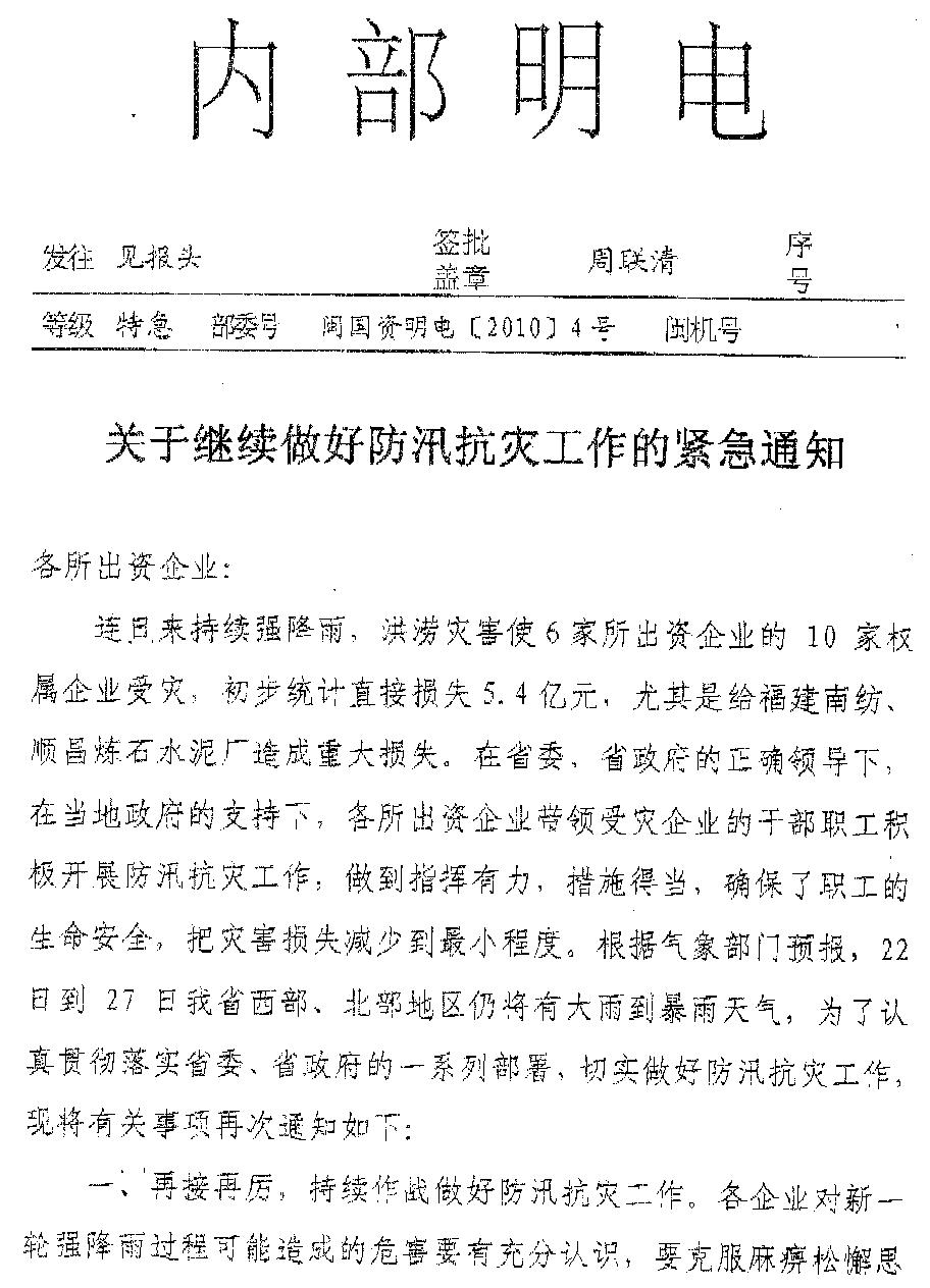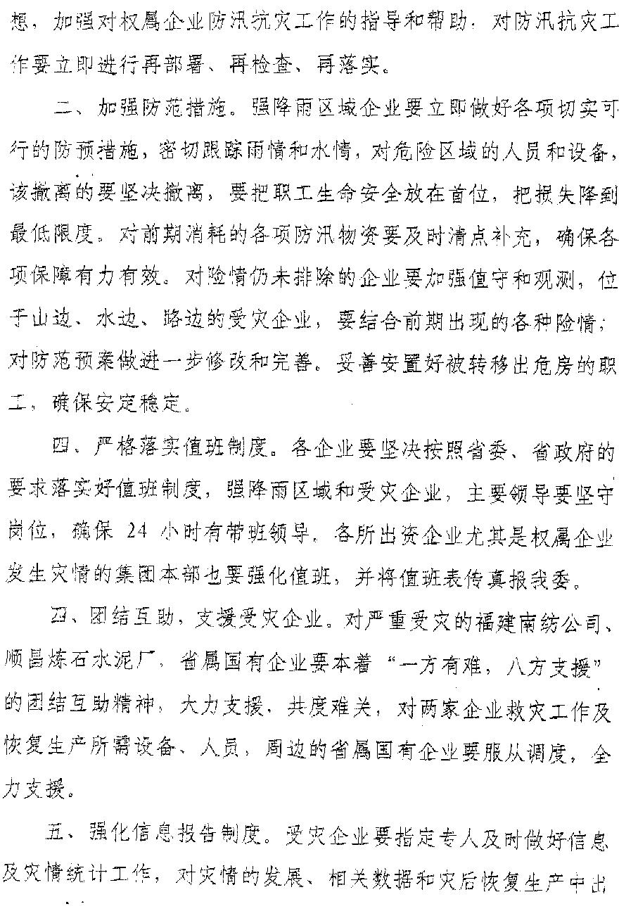 現將福建省人民政府國有資產監督管理委員會《關于繼續做好汛期抗災工作的緊急通知》(閩國資明電〔2010〕4號)轉發給你們。各企業要認真貫徹《通知》精神,堅決貫徹省委、省政府關于防汛救災的一系列部署,克服僥幸、麻痹、松懈思想,克服厭倦、畏難情緒,加大巡查力度,針對有可能發生的地質災害,要采取果斷措施,把職工群眾生命安全放在第一位,及時轉移人員和財產,確保人員安全和財產損失降低到最低程度。